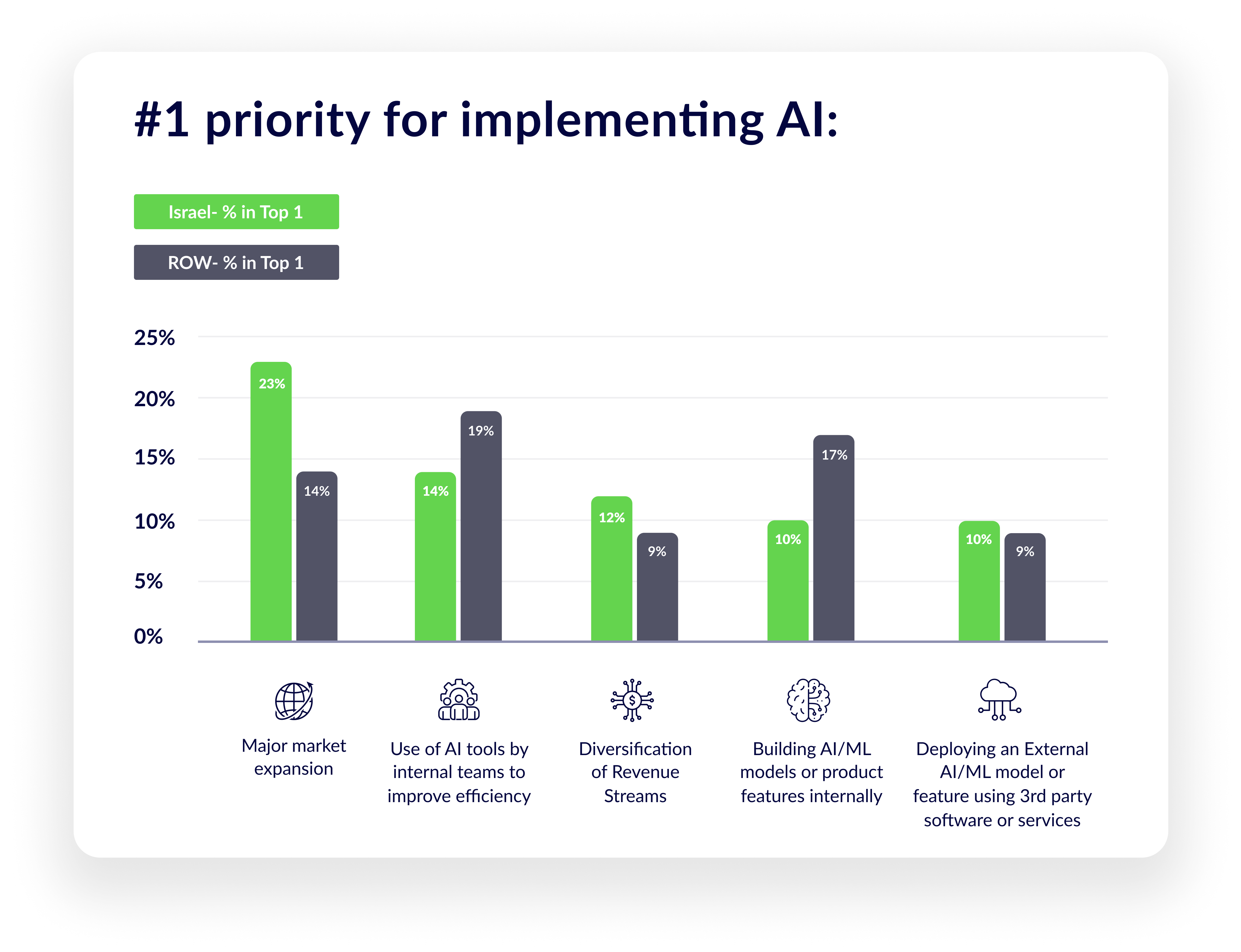 23% of Israeli organizations chose “major markets expansion” as their No. 1 priority for AI. Outside Israel, the top priorities: improving internal efficiency (19%) and building new models or products (17%)