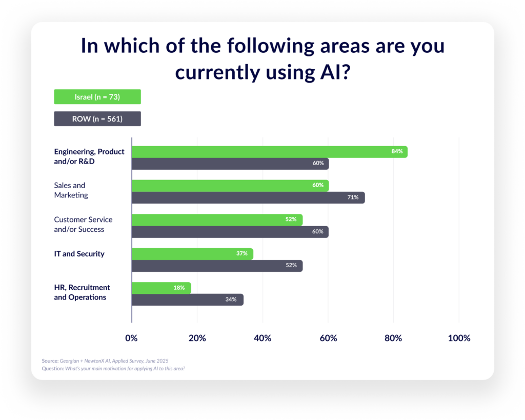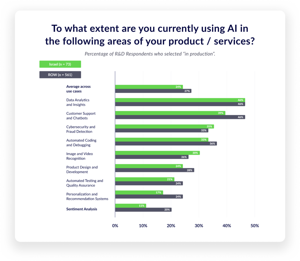 Overall R&D usage in Israel resembles the rest of the world, but adoption is lower in customer‑service chatbots, personalization and recommendation systems, and sentiment analysis. These are clear growth areas for Israeli teams.