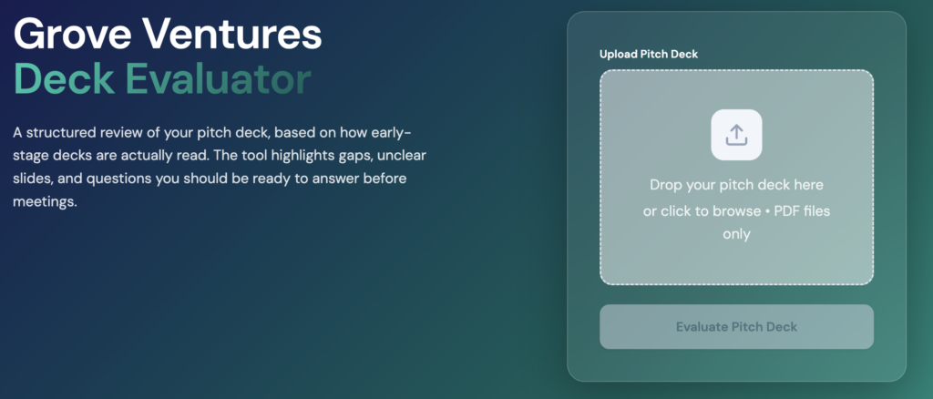 To help founders sharpen that story faster and more efficiently, we’re launching the Grove Deck Evaluator: a tool that provides instant insights for early-stage founders into what’s working, what’s missing, and what can be improved, plus a slide-by-slide investor perspective and action items derived from your pitch deck.